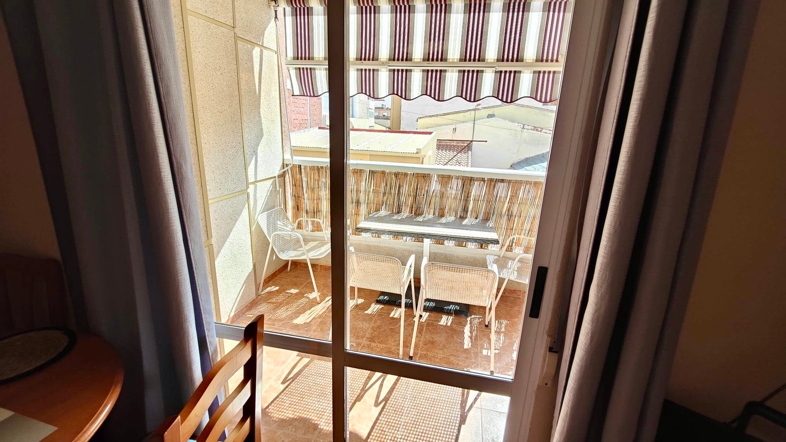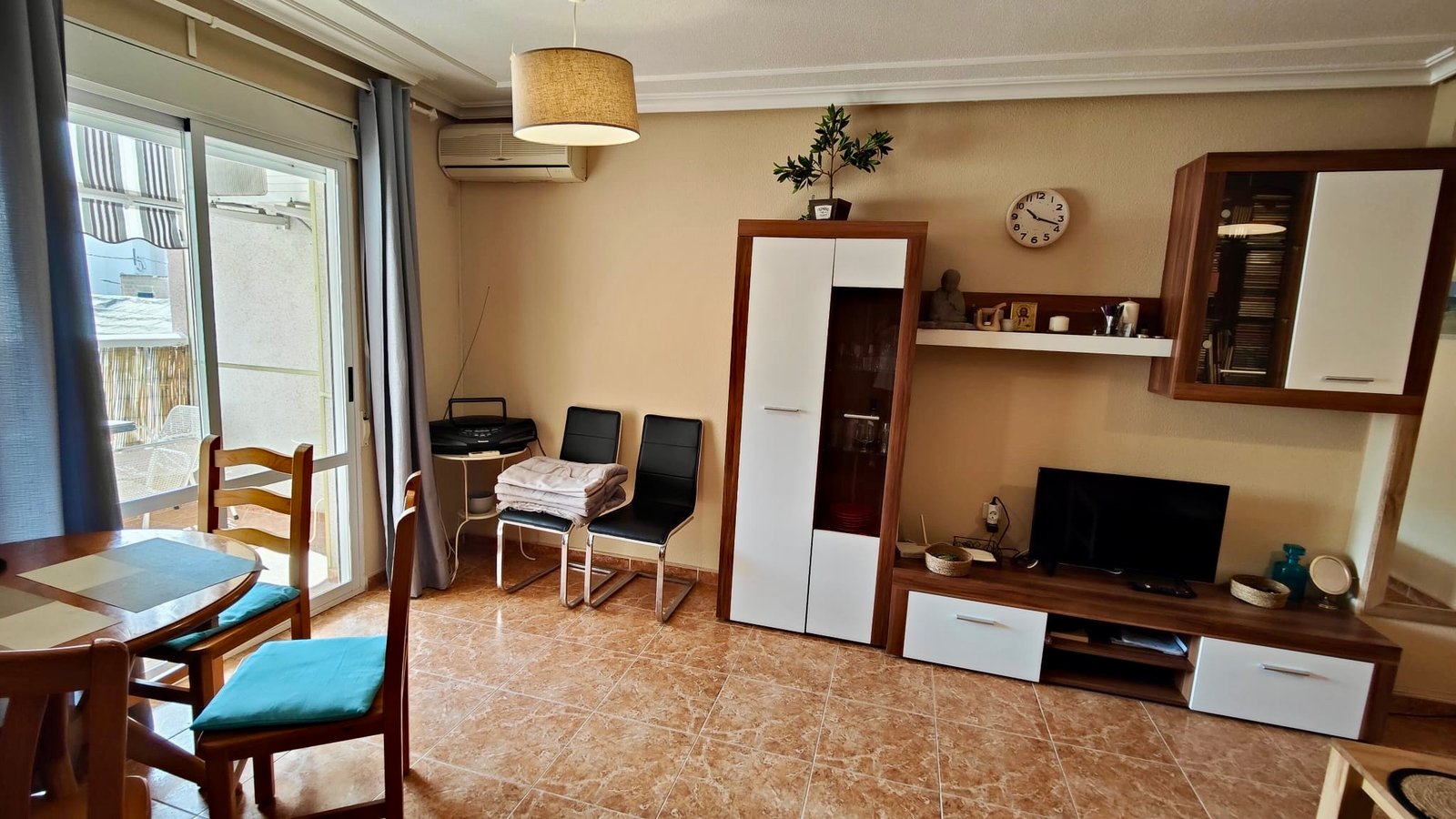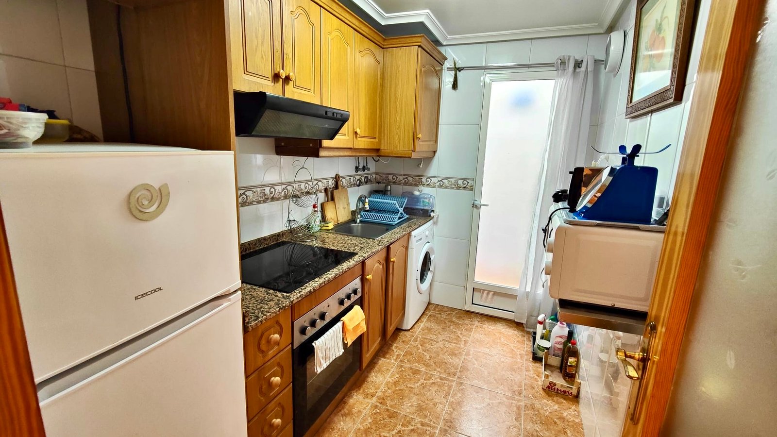 The separate, closed kitchen provides a practical cooking space and benefits from direct access to a private patio, ideal for ventilation and additional storage or utility use. The spacious lounge and dining area is filled with natural light and opens directly onto a pleasant terrace, creating a perfect spot to relax, dine outdoors, or enjoy the mild Mediterranean climate.