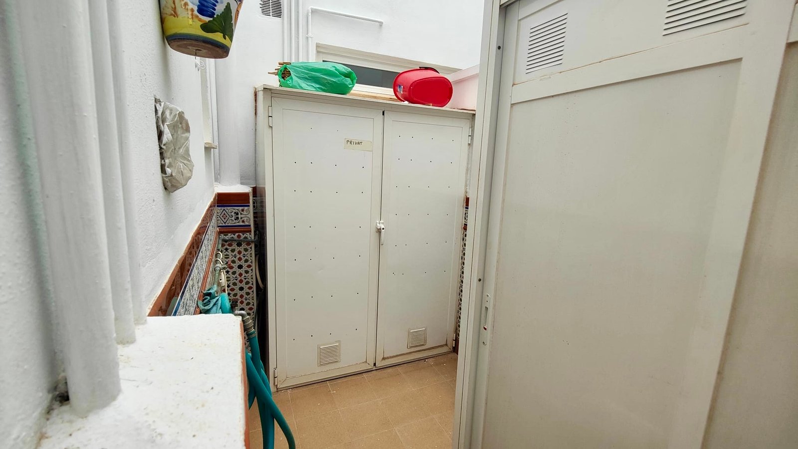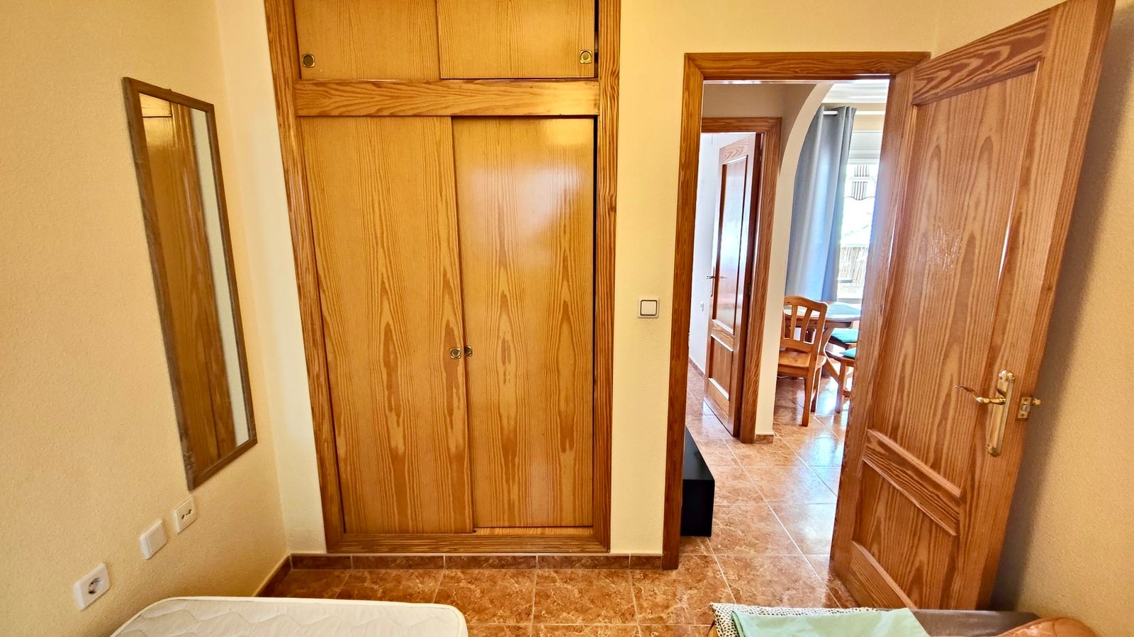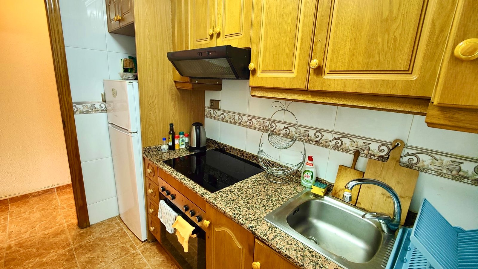 The separate, closed kitchen provides a practical cooking space and benefits from direct access to a private patio, ideal for ventilation and additional storage or utility use. The spacious lounge and dining area is filled with natural light and opens directly onto a pleasant terrace, creating a perfect spot to relax, dine outdoors, or enjoy the mild Mediterranean climate.