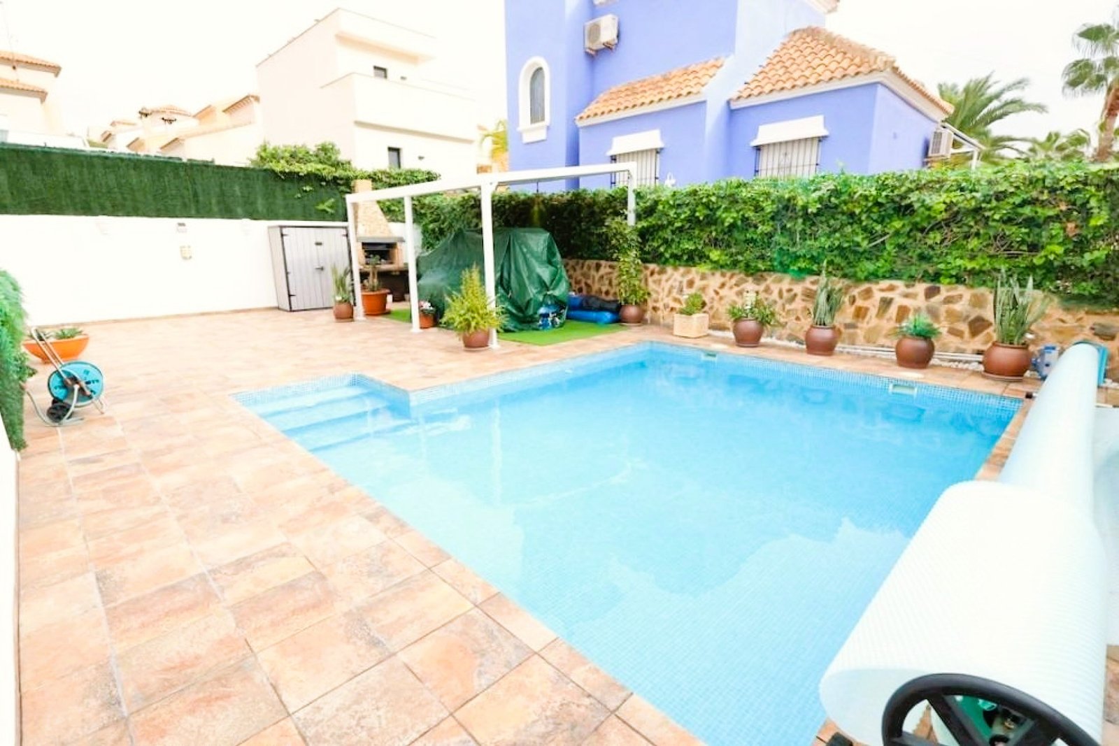 The villa features a private swimming pool, off-road parking, and several inviting outdoor areas. It is set in a quiet location directly facing a park, yet remains excellently connected and within easy reach of supermarkets, restaurants, bars, pharmacies, banks and all essential amenities.