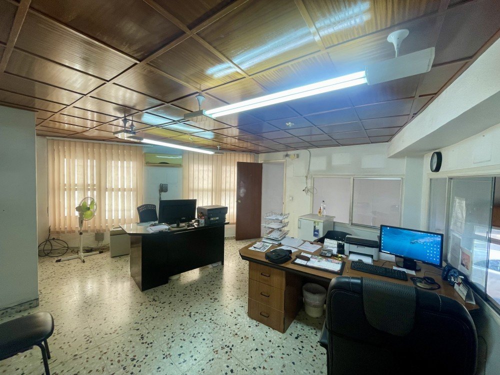 It has electricity, water, a toilet, a security door, a ceiling fan, air conditioning, a safe, and stairs leading to the offices on the upper floor.